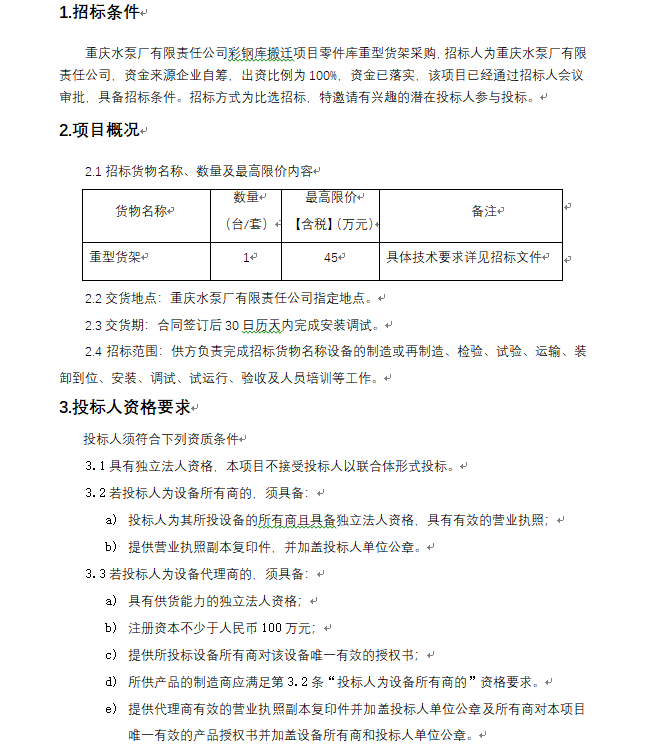 彩鋼庫搬遷項(xiàng)目 零件庫重型貨架采購 招標(biāo)公告
