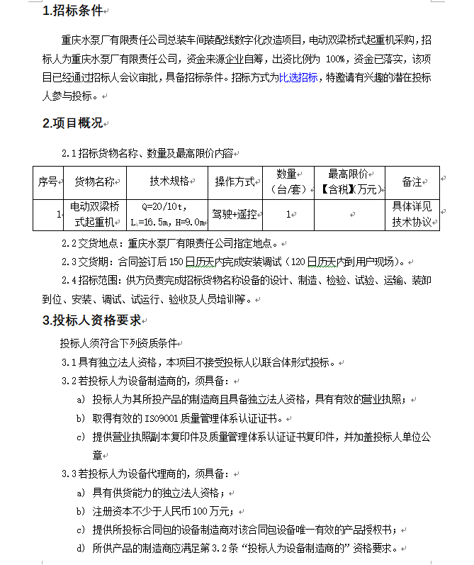 總裝車間裝配線數(shù)字化改造項目 電動雙梁橋式起重機(jī) 招標(biāo)公告