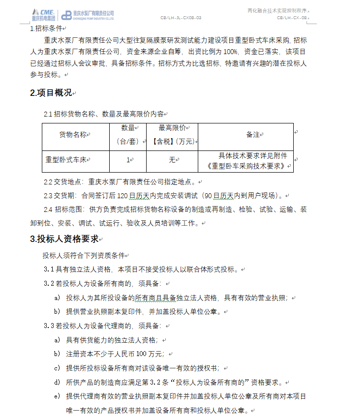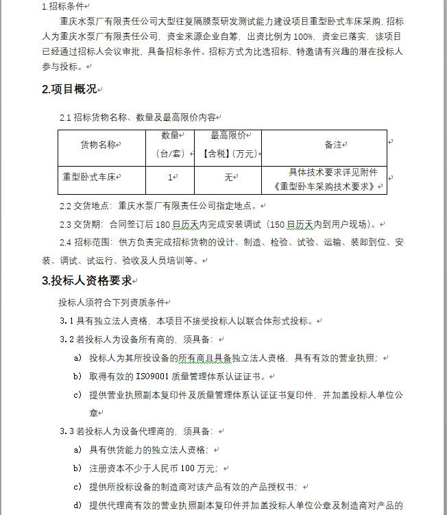 大型往復(fù)隔膜泵研發(fā)測試能力建設(shè)項目 重型臥式車床采購 第二次招標(biāo)公告